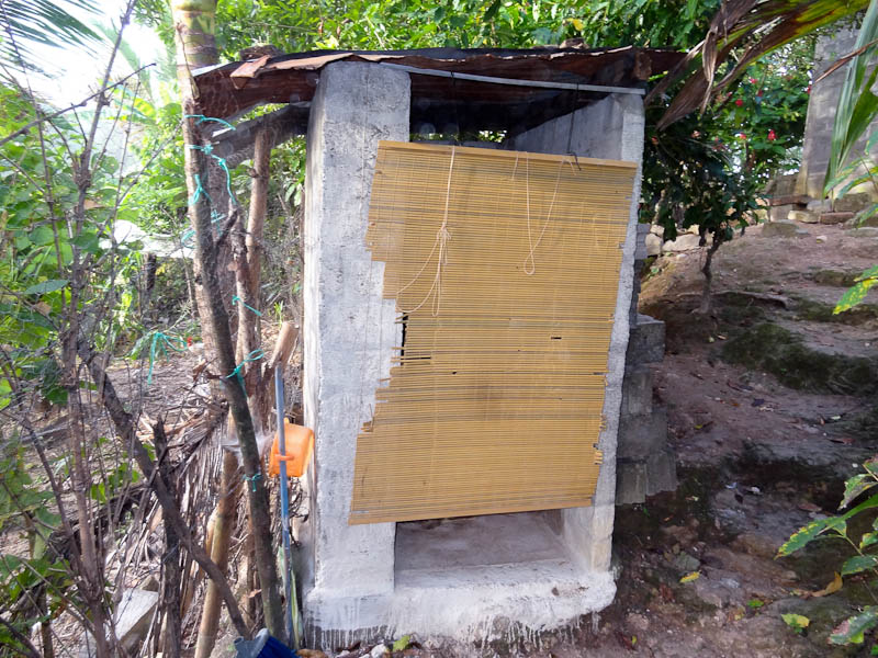 I open the curtain and see something that I’m not supposed to see. I see a chicken in the toilet paper bucket (in the back left corner in the picture to the left). The pipes in Central America are too small for toilet paper, so used toilet paper is discarded in this bucket.