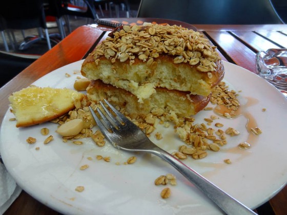 The Perfect Cure For Two Consecutive Nights Of Night Buses And A Canceled Adventure In The AmazonMarch 6, 2012/0 Comments/in Ecuador /by Adam PervezA breakfast of thick pancakes topped with granola and honey! What a cure! Wonderful Breakfast – Thick Pancakes Topped With Granola And Honey