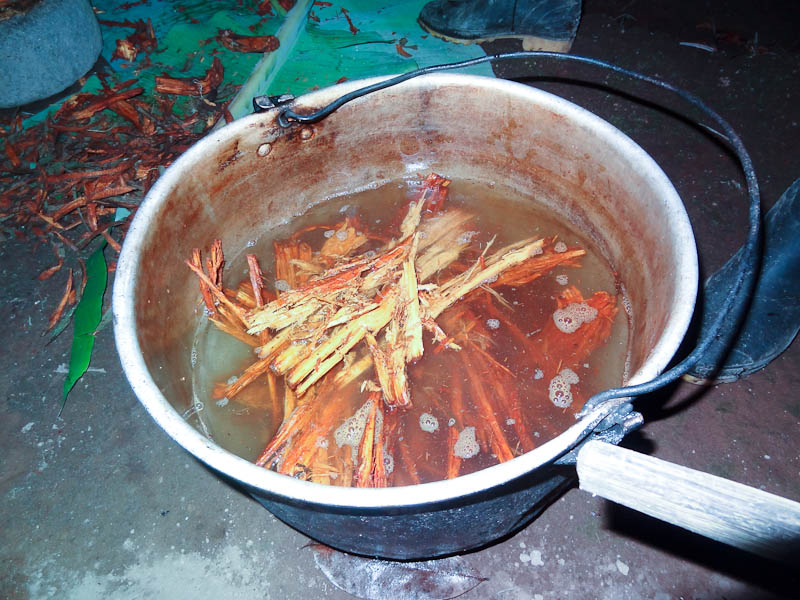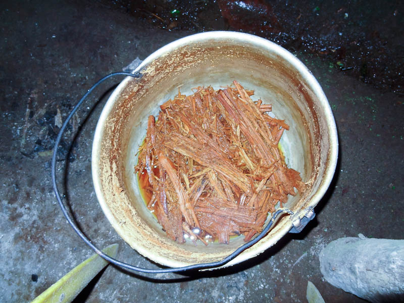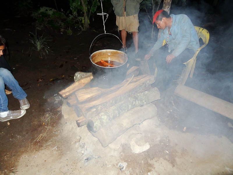 When night came, a large fire was prepared by burning wood gathered from the farm. Budy smashed the ayahuasca plant with a stone and put the pieces in a pot. He added 20 liters/5 gallons of water, and put the pot on the fire. The fire was intense so the water boiled relatively rapidly.