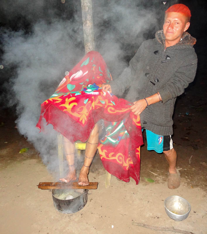 Fully clean on the outside, we returned to the fire. While the concentrated ayahuasca was cooling down, Maro underwent a baño del vapor (steam bath). Rocks that were in the fire were put in a pot containing water and Maro sat inside a blanket and took in the steam.