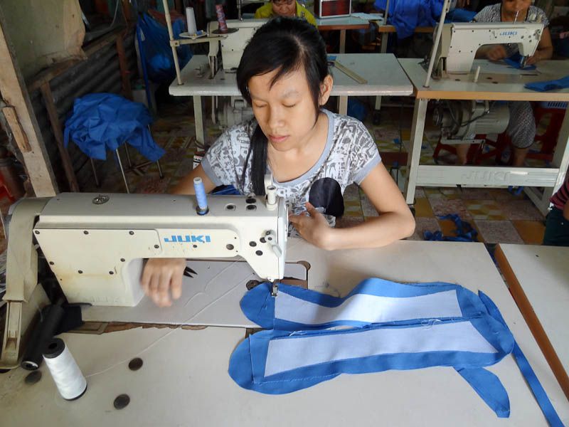 When I walked in I noticed the sewing machines and fabric. There isn’t a ton of equipment. Just a few tables and a some young people with clear disabilities working at them.