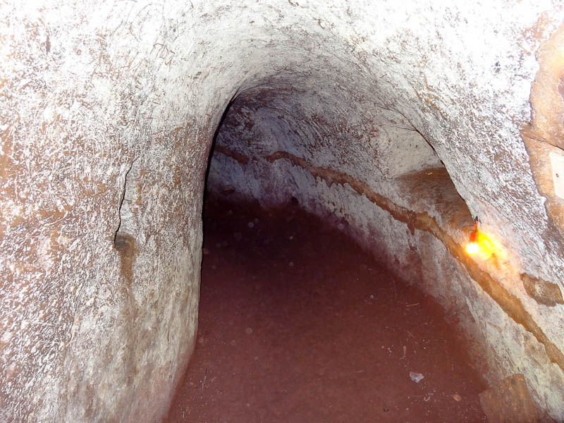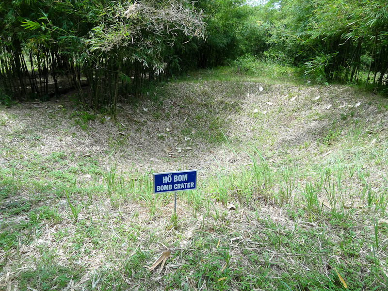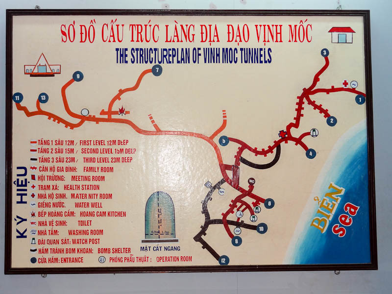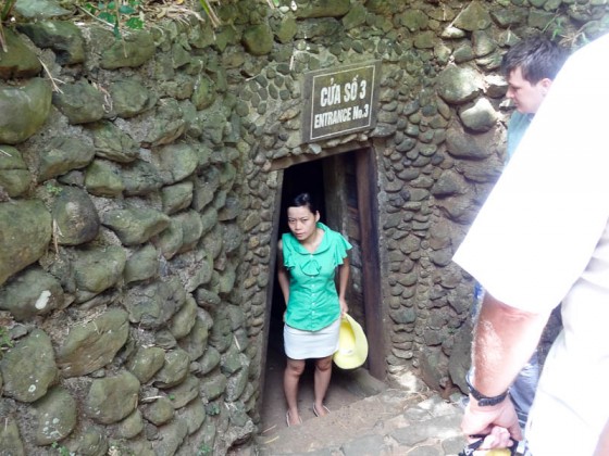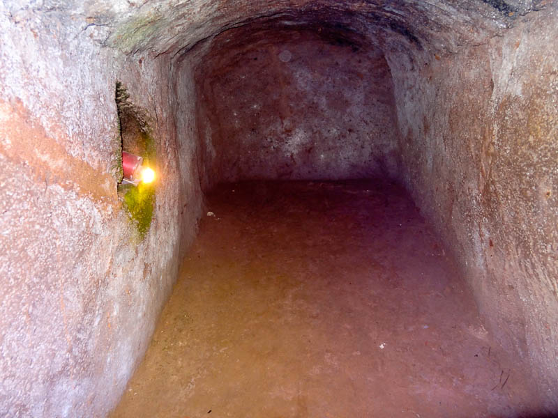 The tunnels were between 1.6-1.9m tall, or 5ft-3in to 6ft-2in. But I’m only 1.7m/5ft-7in and I had to duck most of the way. But for most Vietnamese people there was no problem with the height. Our tour guide kept joking that the tunnels were designed for her, not us.