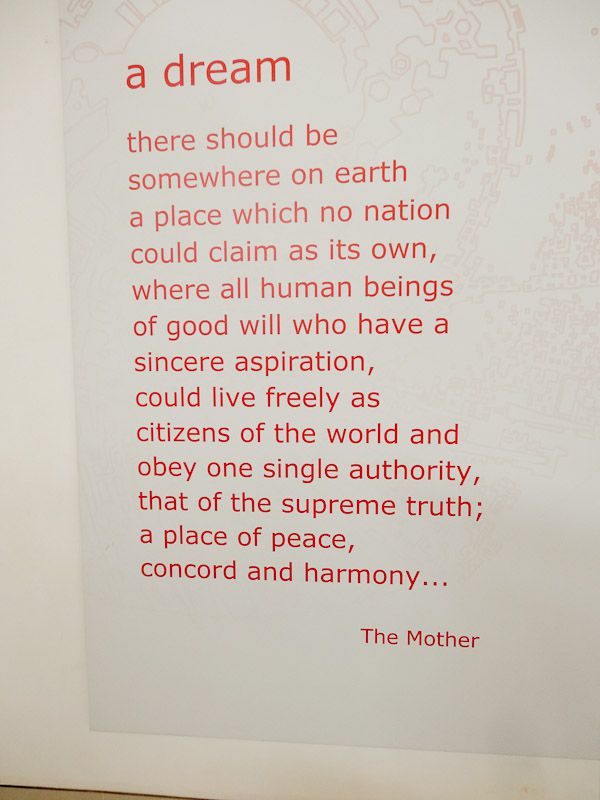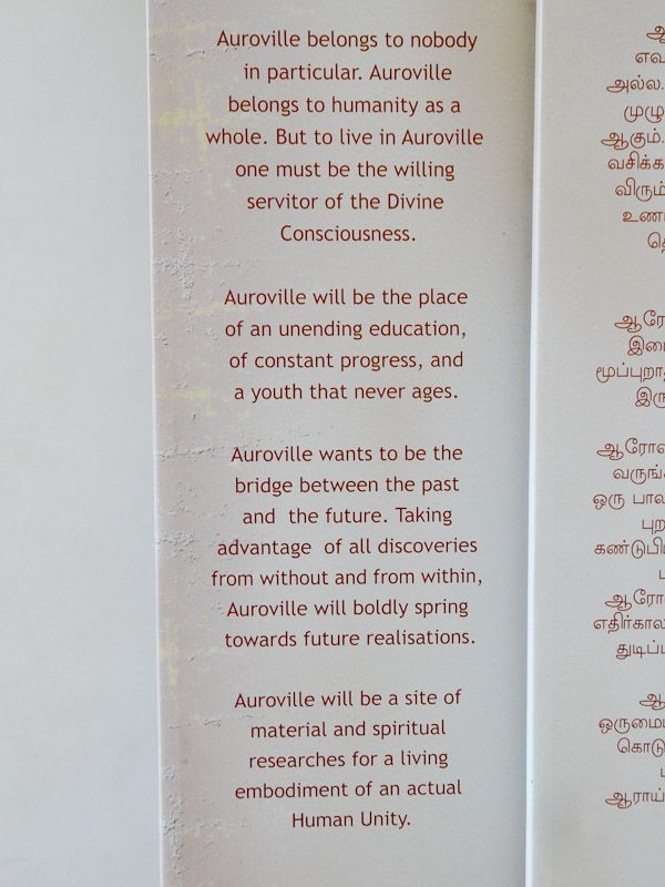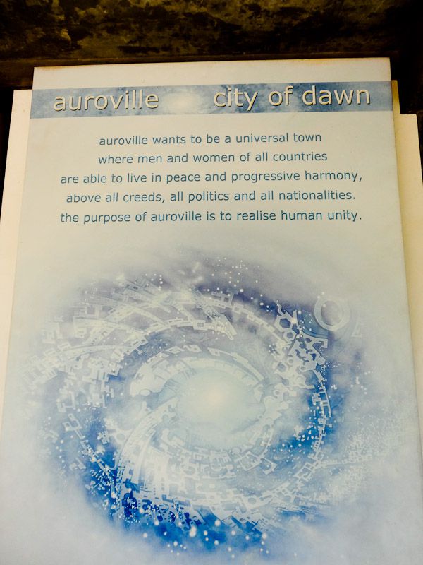 Founded in 1968, Auroville is a so-called “experimental” town. The founder’s first public message about his town was “Auroville is meant to be a universal town where men and women of all countries are able to live in peace and progressive harmony, above all creeds, all politics and all nationalities. The purpose of Auroville is to realize human unity.”